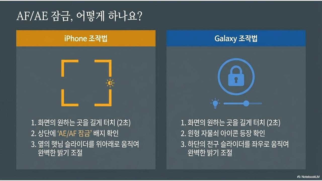 스마트폰 카메라는 기본적으로 자동으로 초점(AF, Auto Focus)과 노출(AE, Auto Exposure — 쉽게 말해 밝기)을 맞춥니다. 대부분의 상황에서 잘 작동합니다. 하지만 가끔 카메라가 엉뚱한 곳에 초점을 맞추거나, 밝기가 왔다 갔다 하는 경우가 있습니다.