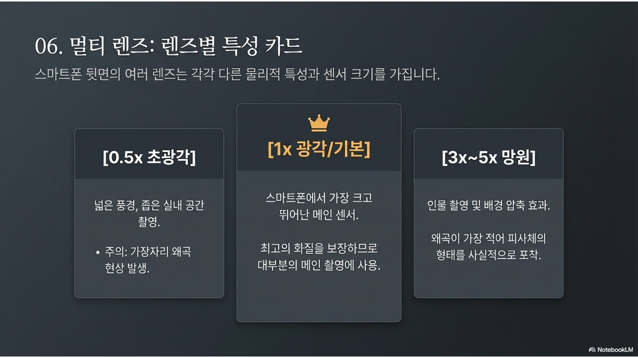 최신 스마트폰 뒷면을 보면 카메라 렌즈가 2개, 3개, 심지어 4개까지 달려 있습니다. 이 여러 개의 렌즈는 장식이 아닙니다. 각각 완전히 다른 특성을 가진 독립적인 렌즈입니다. 전문 카메라에서 렌즈를 교체하며 촬영하는 것과 같은 원리가 여러분의 손 안에 들어 있는 셈입니다.