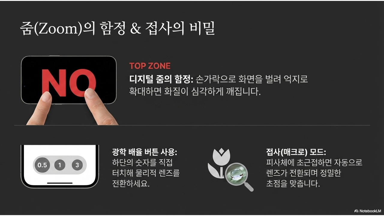 디지털 줌(핀치 줌)은 절대 쓰지 마세요. 두 손가락으로 화면을 확대하는 것은 이미 찍힌 이미지를 소프트웨어로 늘리는 것이라 화질이 심각하게 떨어집니다. 마치 작은 사진을 포토샵에서 억지로 키운 것과 같습니다. 반드시 화면 하단의 배율 버튼(0.5, 1, 3, 5 등)을 직접 터치하여 물리적 렌즈를 전환하세요. 이것이 실제 광학 줌입니다. 버튼이 아닌 손가락 핀치 줌으로 1.5x, 2.3x 같은 중간 배율을 만들면, 그 순간부터 디지털 줌이 개입하여 화질이 떨어집니다.