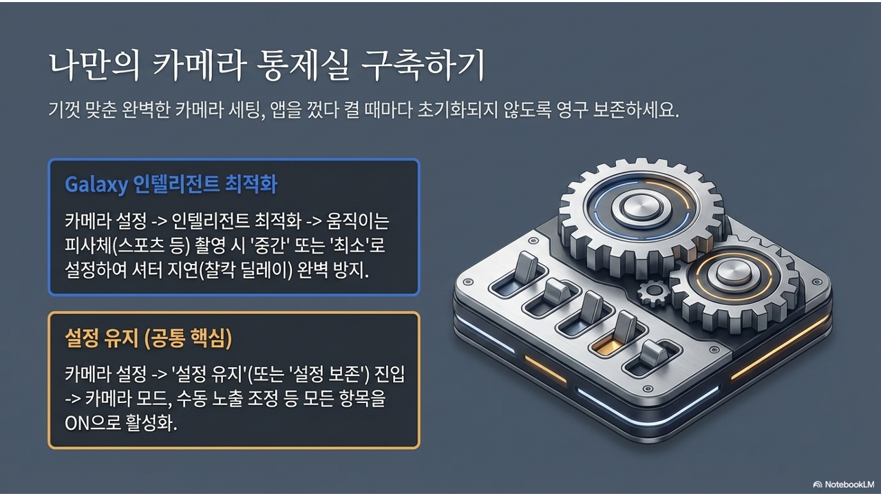 프로 모드에서 ISO, 화이트 밸런스 등을 정성껏 맞춰놓았는데, 카메라 앱을 닫았다 열면 전부 초기화되는 경험을 해본 적 있나요? '설정 유지' 기능을 켜두면 마지막으로 사용한 설정값이 다음에도 그대로 유지됩니다.