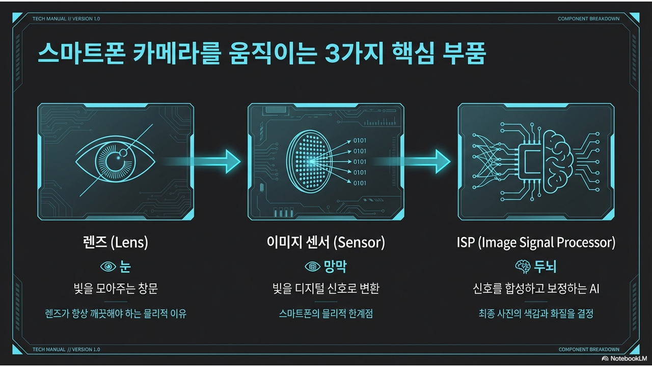 ③ 이미징 엔진(ISP) = 두뇌 — 센서가 보낸 전기 신호를 우리가 보는 사진(이미지 파일)으로 변환합니다. 뇌가 시신경의 신호를 해석해 "풍경"이나 "얼굴"로 인식하는 것처럼, ISP(Image Signal Processor)는 수백만 개의 전기 신호를 조합해 하나의 이미지를 만들어냅니다.