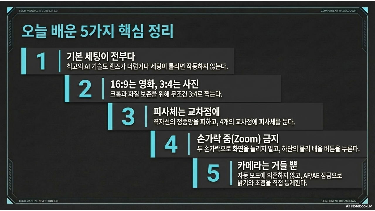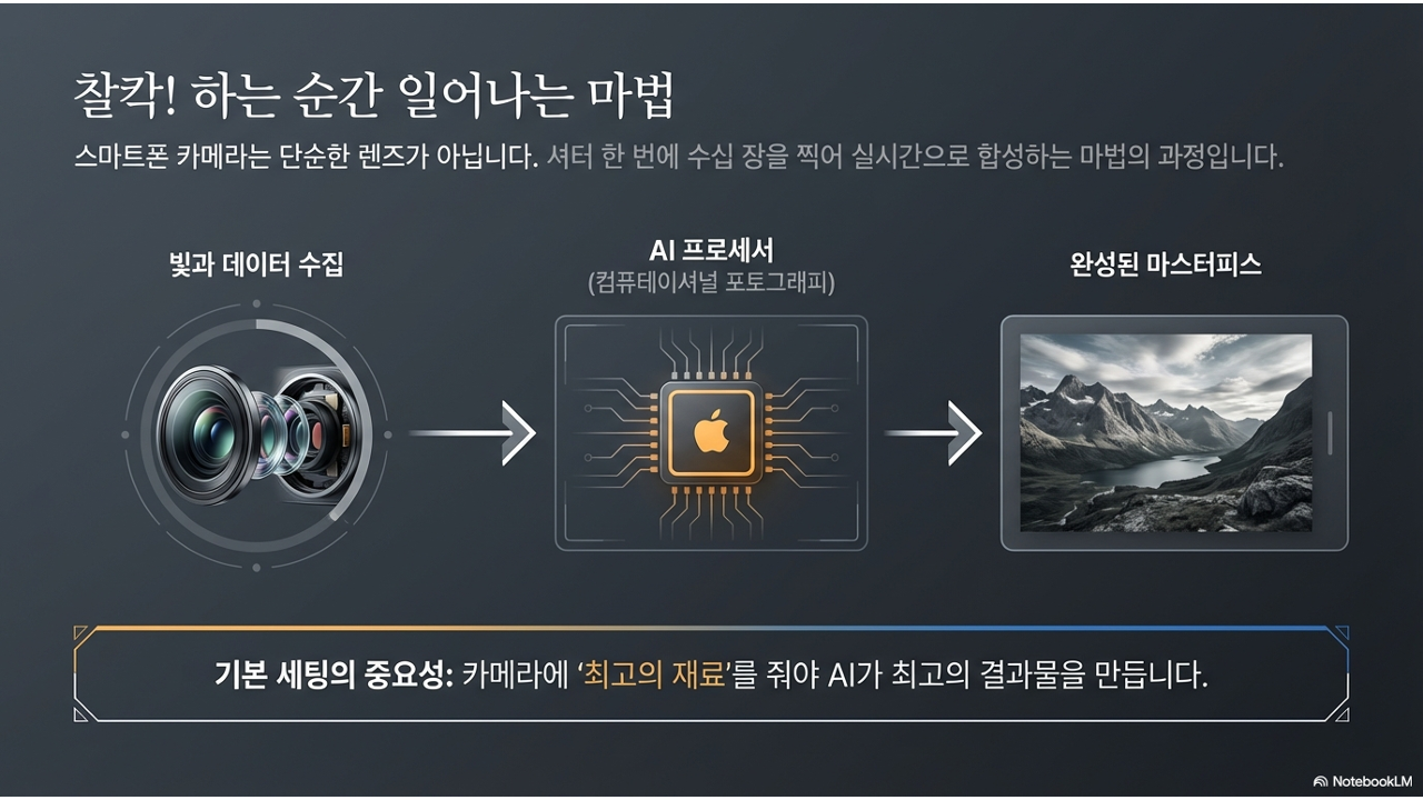 그런데 문제가 하나 있습니다. 이 놀라운 기술의 90%는 기본 세팅이 맞아야만 제대로 작동합니다. 렌즈에 지문이 묻어 있으면 AI가 아무리 똑똑해도 흐릿한 데이터를 선명하게 바꿀 수 없고, 사진 비율이 잘못 설정되면 센서의 절반을 그냥 버리는 셈이 됩니다.