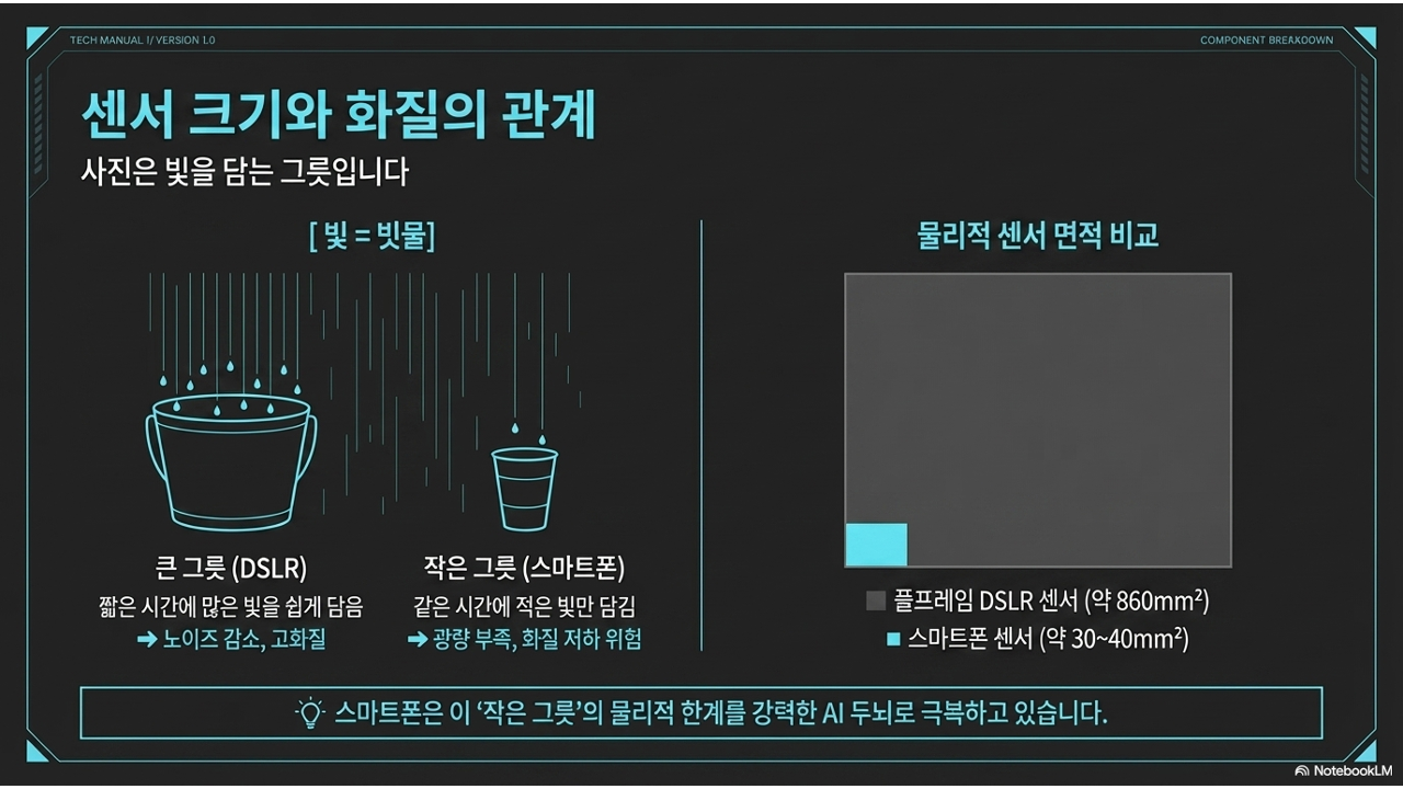 DSLR의 풀프레임 센서는 약 24×36mm 크기입니다. 반면 스마트폰의 메인 센서는 약 5×7mm 수준입니다. 면적으로 비교하면 약 30배 이상 차이가 납니다.