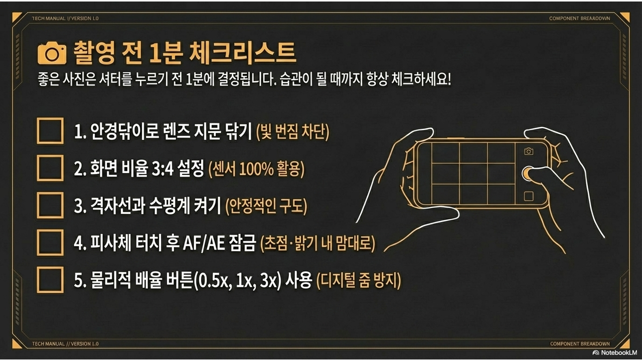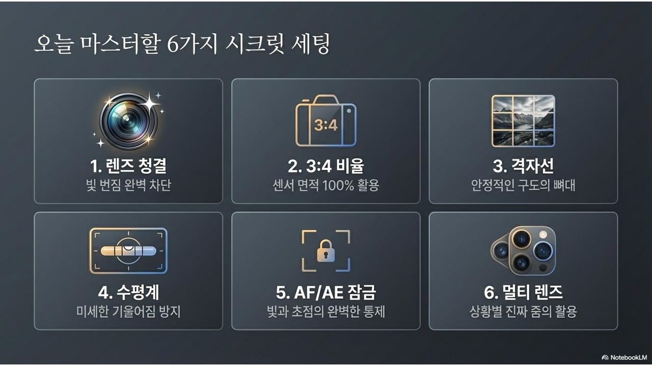 오늘은 촬영 전 딱 1분 안에 확인할 수 있는 핵심 세팅 6가지를 완벽하게 익혀서, 여러분 스마트폰의 숨겨진 성능을 100% 끌어내 보겠습니다.