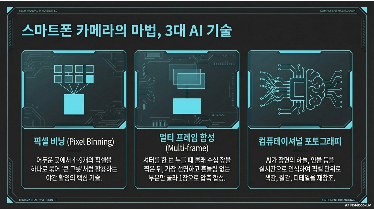 컴퓨테이셔널 포토그래피: 위의 기술들을 총칭하는 말입니다. HDR(밝은 곳과 어두운 곳 모두 디테일 살리기), 노이즈 감소, 선명화 처리 등을 AI가 실시간으로 수행합니다.