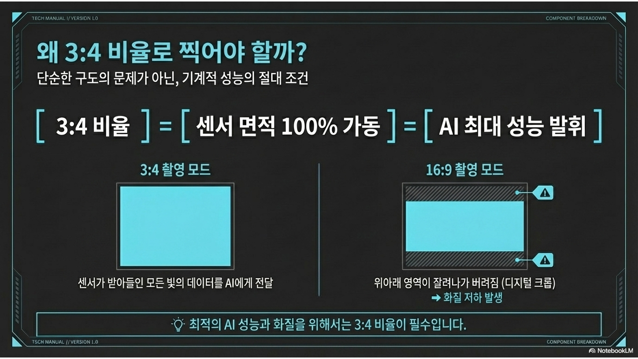 AI도 마법사가 아닙니다. AI가 좋은 사진을 만들려면 충분한 양의 원본 데이터가 필요합니다. 3:4 비율은 AI에게 최고의 재료를 주는 것과 같습니다. 센서 100% 활용 = 최대 빛 수집 = AI 성능 극대화. 이 공식을 기억하세요.