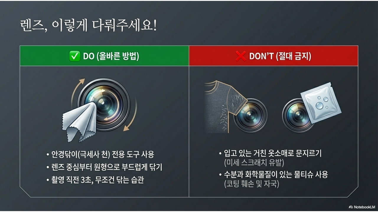 절대 하지 말아야 할 것도 있습니다. 교복 소매, 티셔츠 같은 거친 천으로 렌즈를 닦으면 표면의 반사 방지 코팅이 조금씩 긁혀 나갑니다. 당장은 차이를 못 느끼지만, 몇 달 뒤면 코팅이 벗겨진 부분에서 빛이 반사되어 장기적인 화질 저하가 생깁니다.