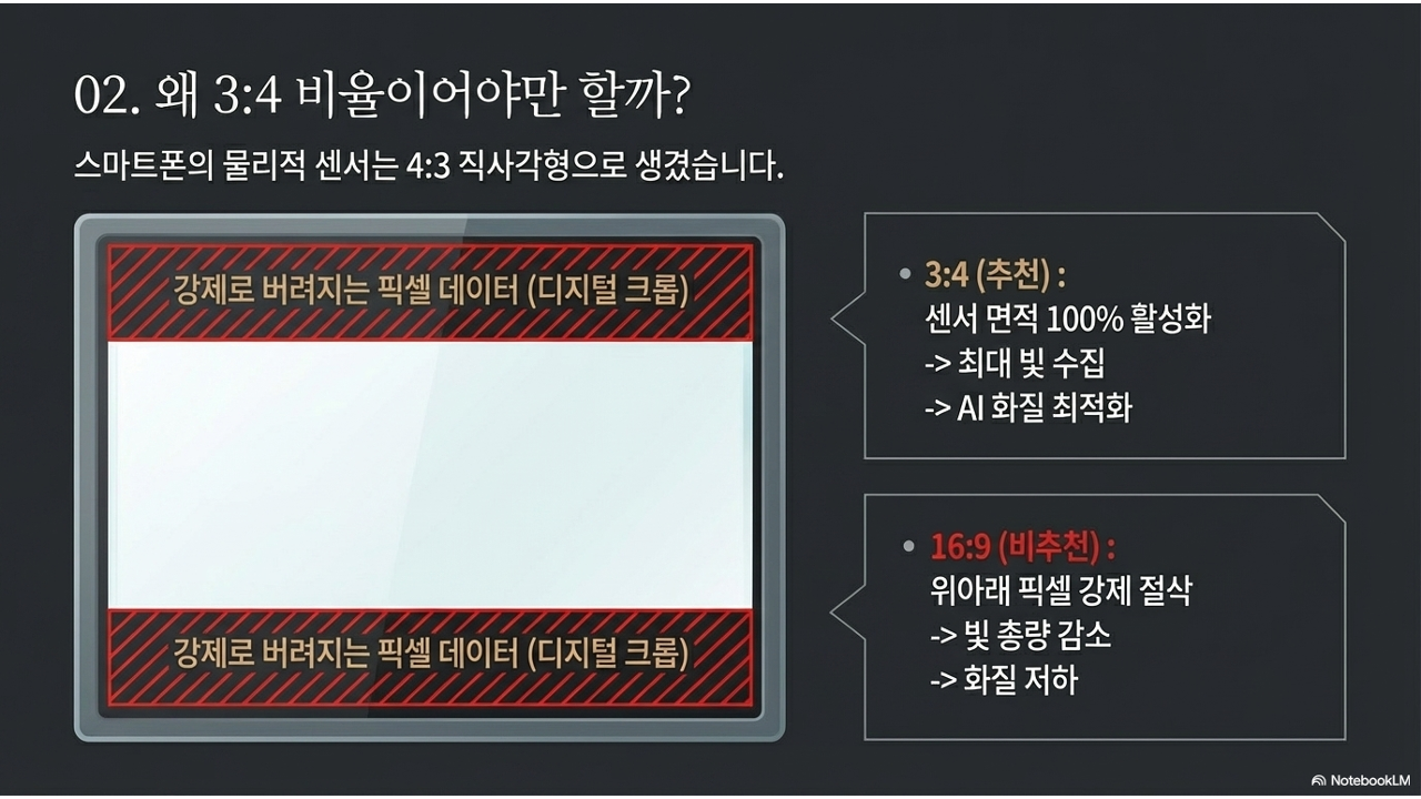 앞에서 "3:4로 촬영해야 센서 전체를 쓴다"고 했는데, 이제 그 이유가 더 명확해졌습니다. 센서의 모든 픽셀이 빛을 수집해야 AI에게 가장 풍부한 데이터를 제공할 수 있습니다. 16:9로 바꾸면 센서 위아래의 픽셀들이 비활성화되어, 물리적으로 수집하는 빛의 총량이 줄어듭니다.