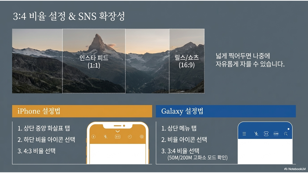 정리하면: 3:4로 촬영 → 최고 화질 확보 + 편집 시 유연한 크롭 가능. 이것이 프로 사진가들이 RAW 촬영 시 항상 최대 비율을 사용하는 것과 같은 원리입니다.