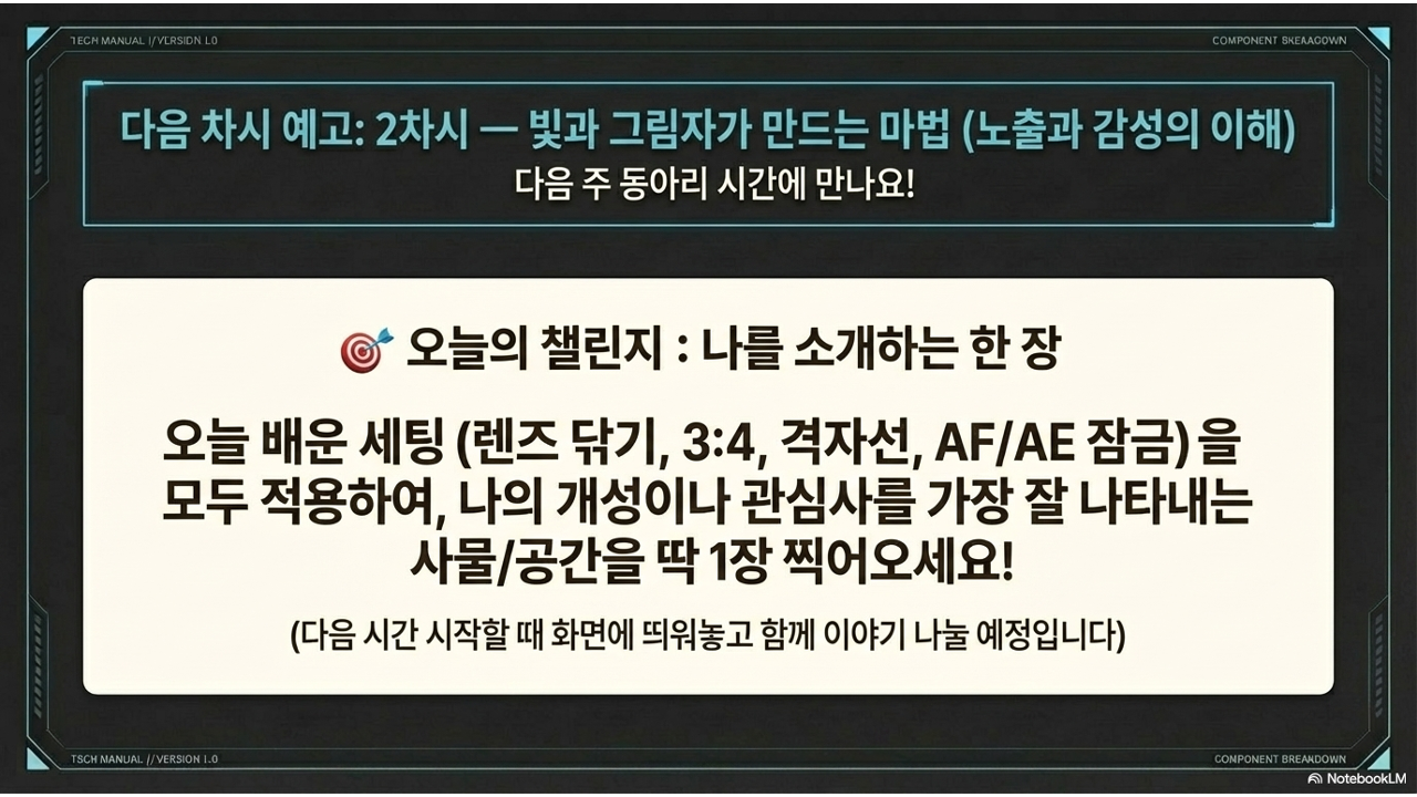 예를 들어, 학교 운동장에서 벚꽃나무를 찍는다고 해봅시다. 나무를 화면 정중앙에 놓으면 평범한 기록 사진이 됩니다. 하지만 나무를 왼쪽 교차점에 놓고 오른쪽에 하늘과 구름의 여백을 두면? 갑자기 '감성 사진'이 됩니다. 격자선의 힘입니다. 구도에 대한 자세한 내용은 2차시에서 본격적으로 다룹니다.