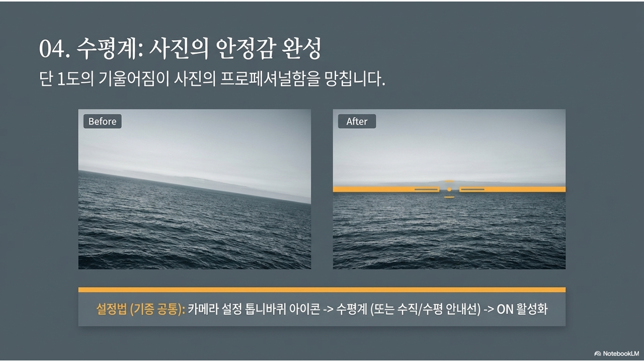 풍경이나 건물을 찍을 때 지평선이나 건물 수직선이 단 1도만 기울어져도 사진 전체의 안정감이 무너집니다. 사람의 눈은 수평과 수직에 매우 민감해서, 미세한 기울어짐도 "뭔가 어색하다"고 느낍니다.