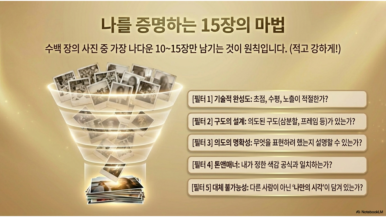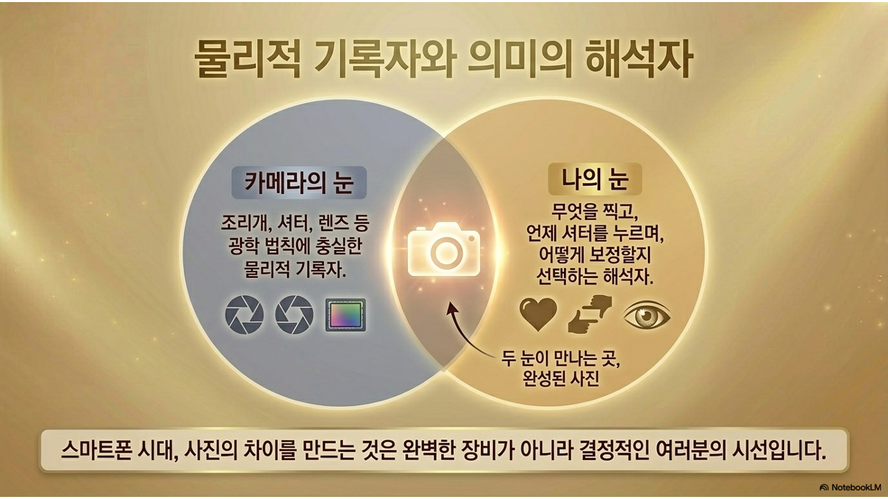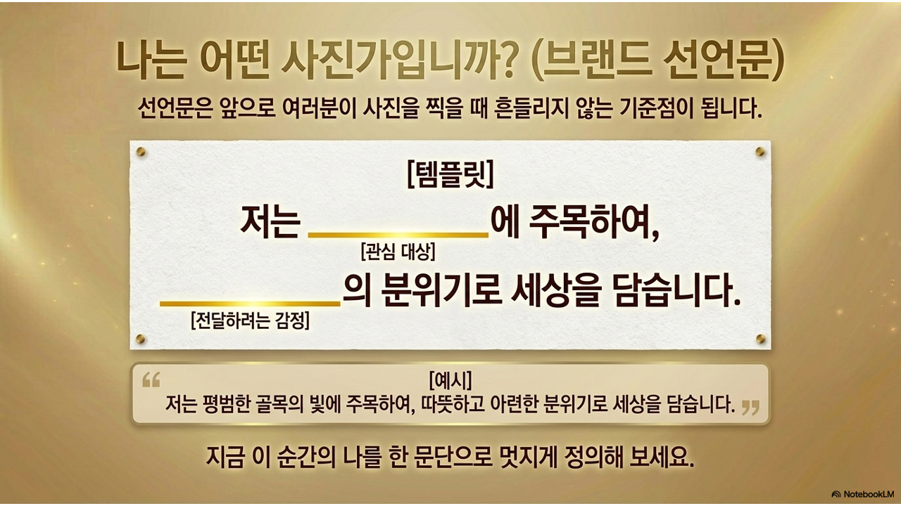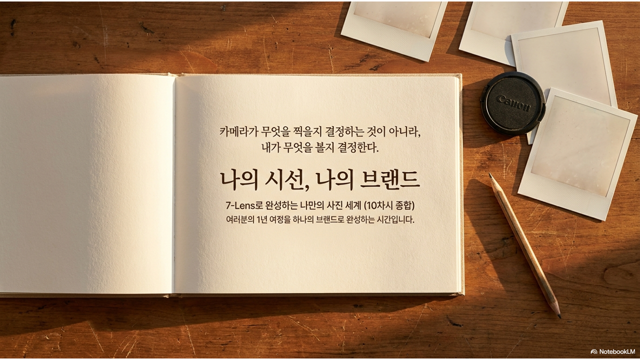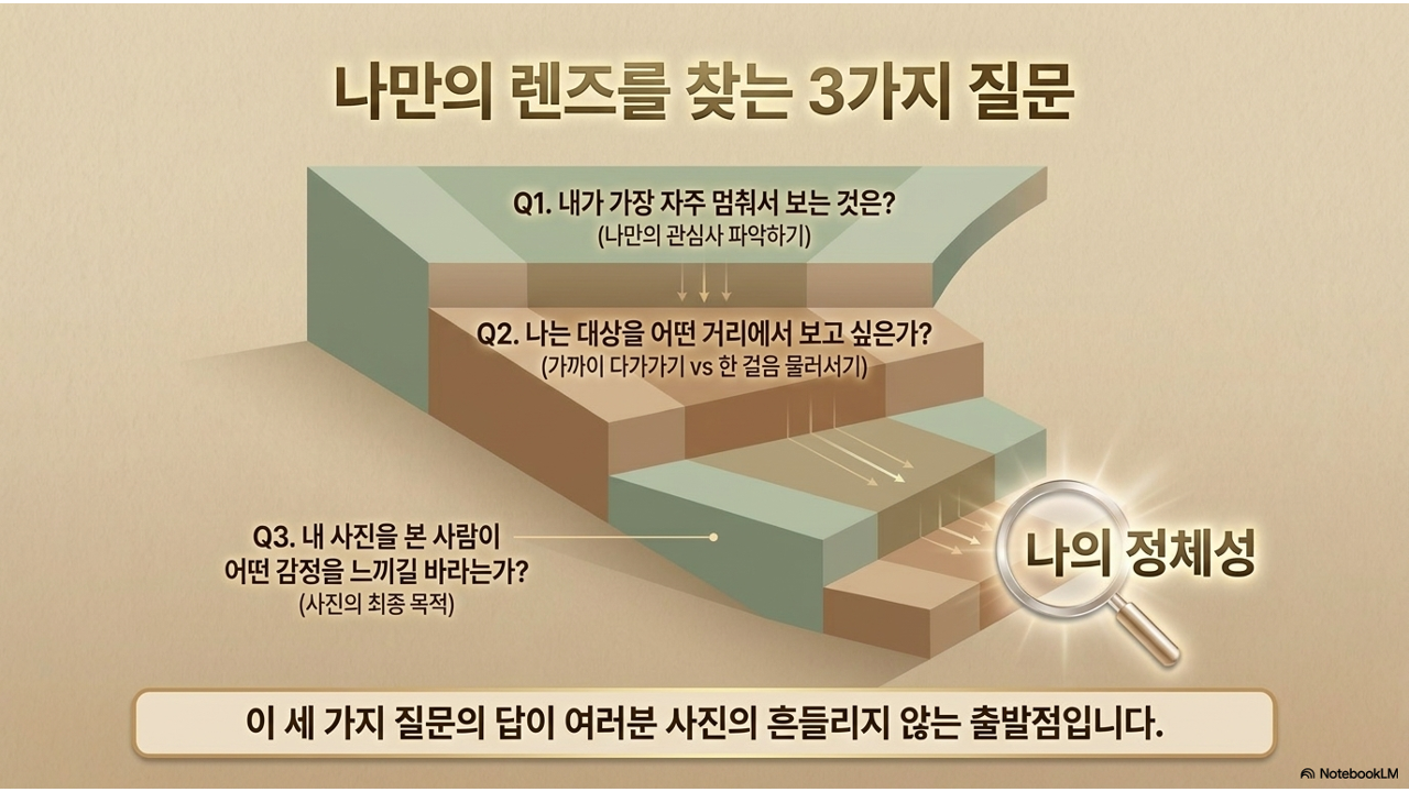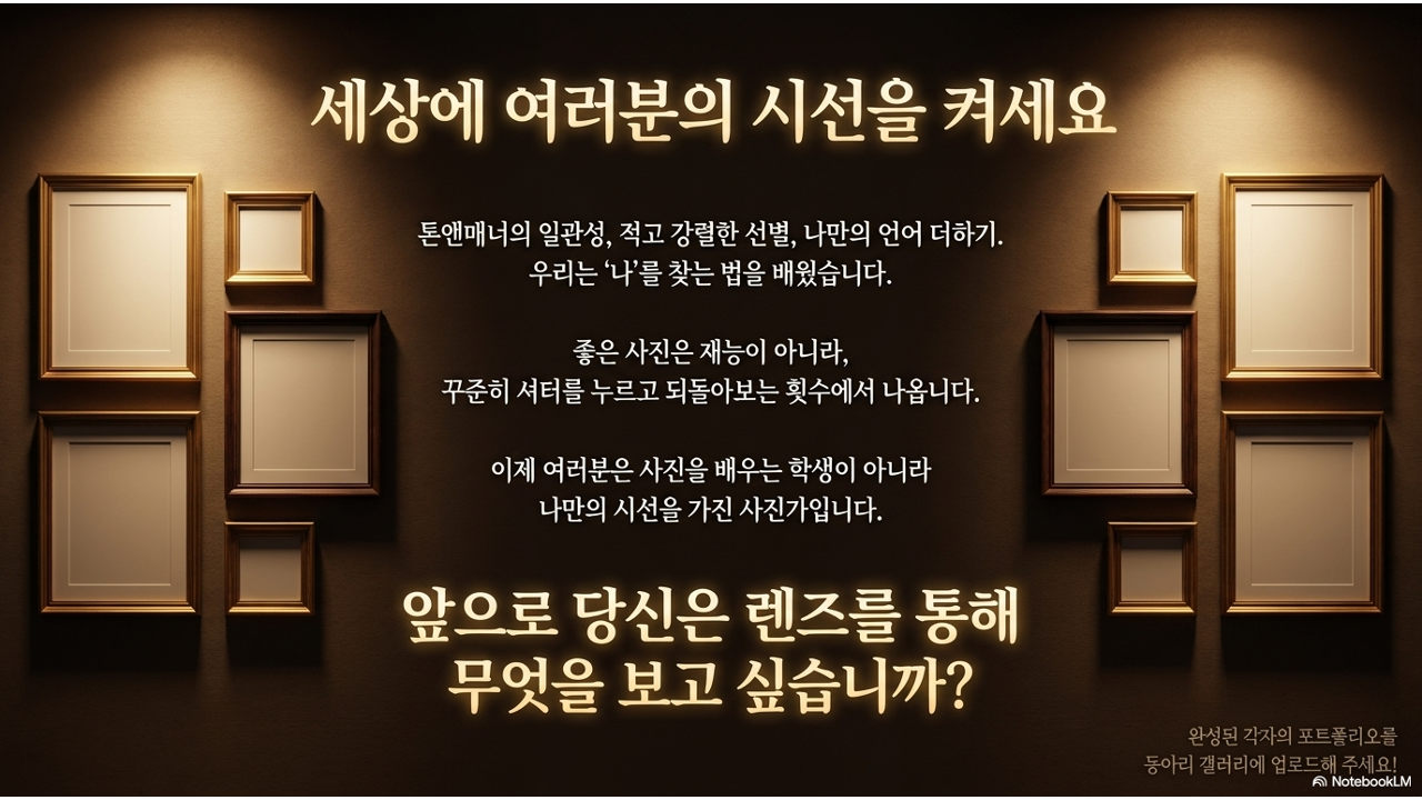 🎯 이것만 기억하세요: 카메라는 도구이고, 시선은 나의 것입니다. 기술은 가르쳐드릴 수 있지만, 당신이 무엇을 볼지는 오직 당신만이 결정할 수 있습니다. "당신은 무엇을 보고 싶은가?"