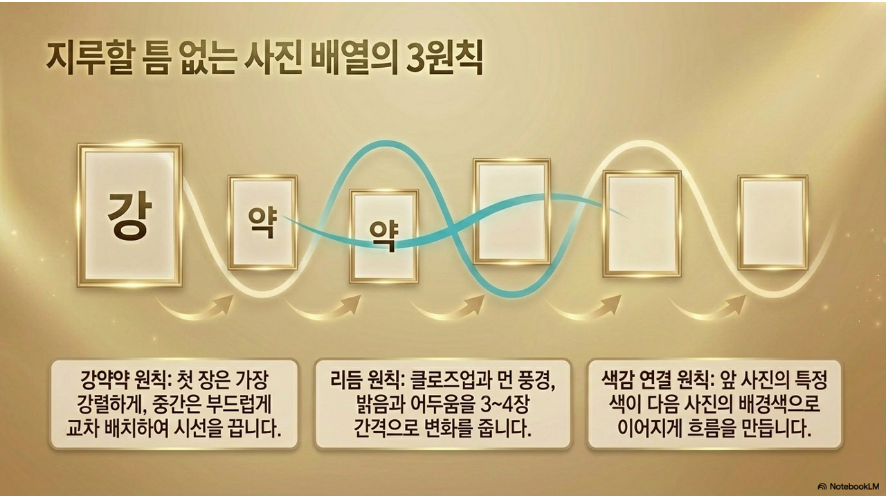 - 3장씩 한 묶음으로 기획하면 자연스러운 리듬이 생깁니다. 예: 인물-풍경-디테일.