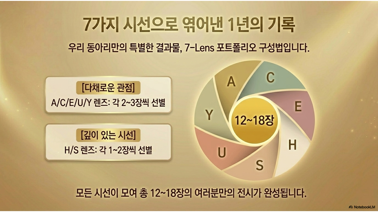 일반 포트폴리오가 "내가 좋아하는 사진 모음"이라면, 7-Lens 포트폴리오는 "7가지 시선으로 세상을 본 나의 1년의 기록"입니다.