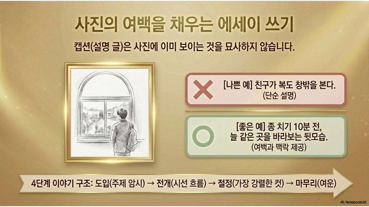 | 4. 마무리 (1~2장) | 여운을 남기는 사진. 에세이 전체의 메시지. | 여운 |