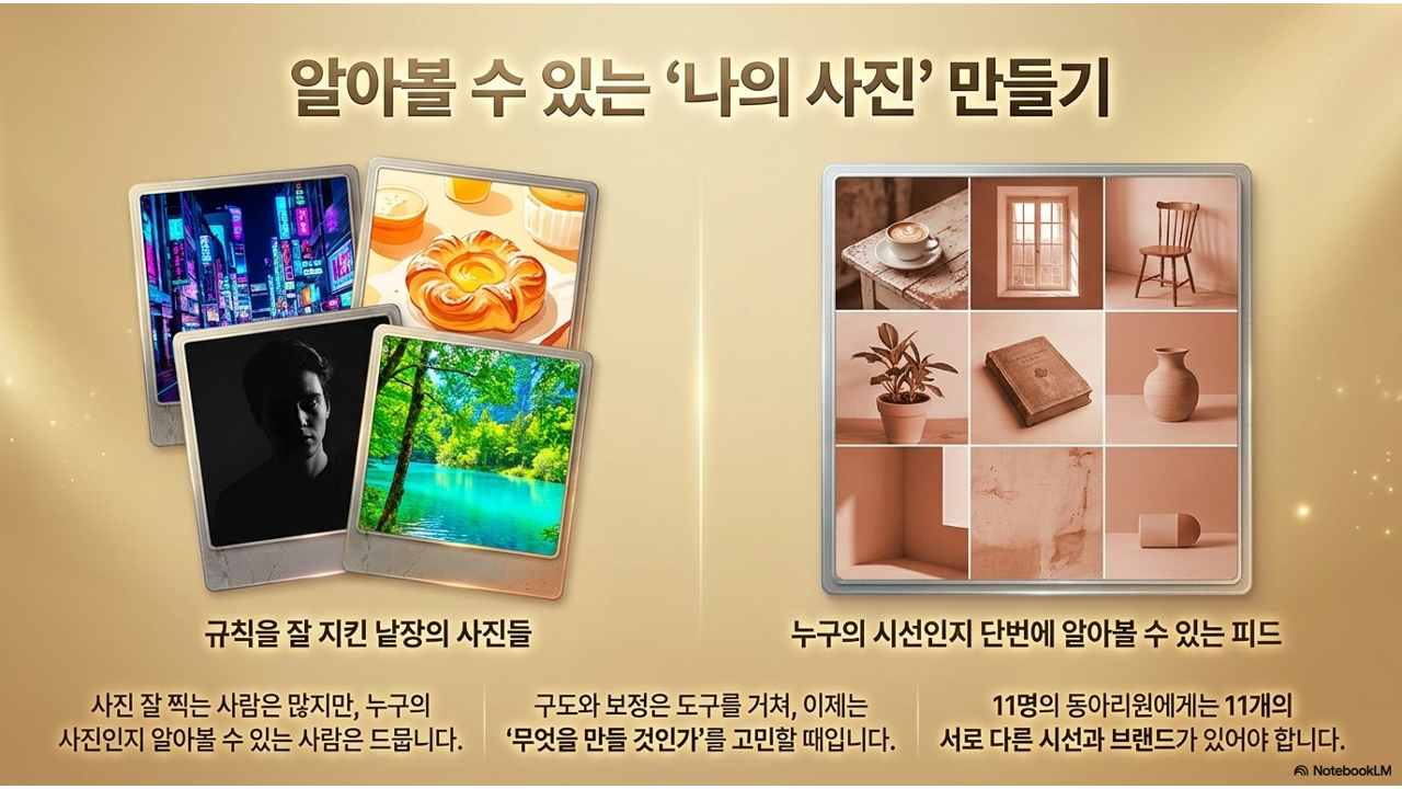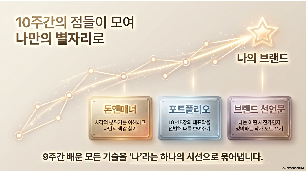 이 모든 기술은 도구입니다. 망치와 톱과 못을 아무리 많이 가지고 있어도, "무엇을 만들 것인가"가 없으면 아무것도 만들어지지 않습니다. 10차시는 바로 그 "무엇을 만들 것인가"를 답하는 시간입니다. 내가 찍는 사진 전체를 관통하는 나의 시선, 나의 브랜드를 세워봅시다.
