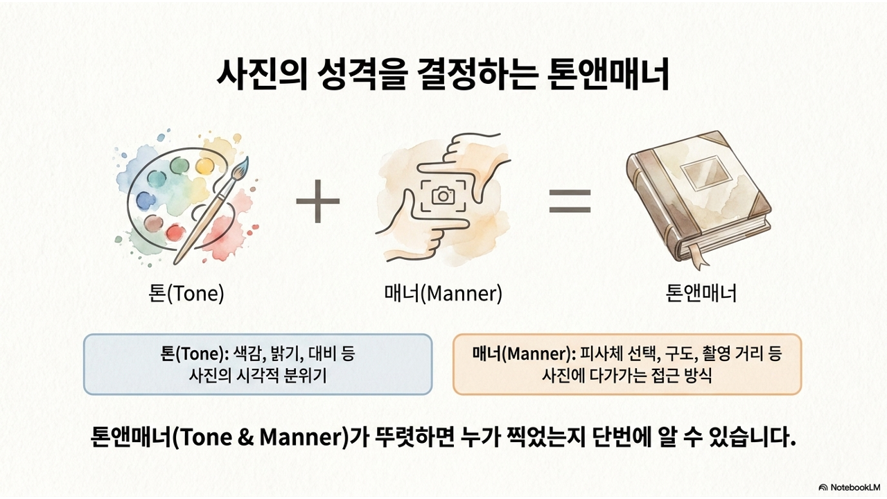 톤앤매너(Tone & Manner)는 원래 광고·디자인 분야에서 쓰이는 용어로, "전체적인 분위기와 표현 방식의 일관성"을 말합니다. 사진에서는 여러 장의 사진을 한 자리에 모아놓았을 때, 같은 사람이 찍은 것처럼 느껴지게 하는 공통 분위기를 뜻합니다.
