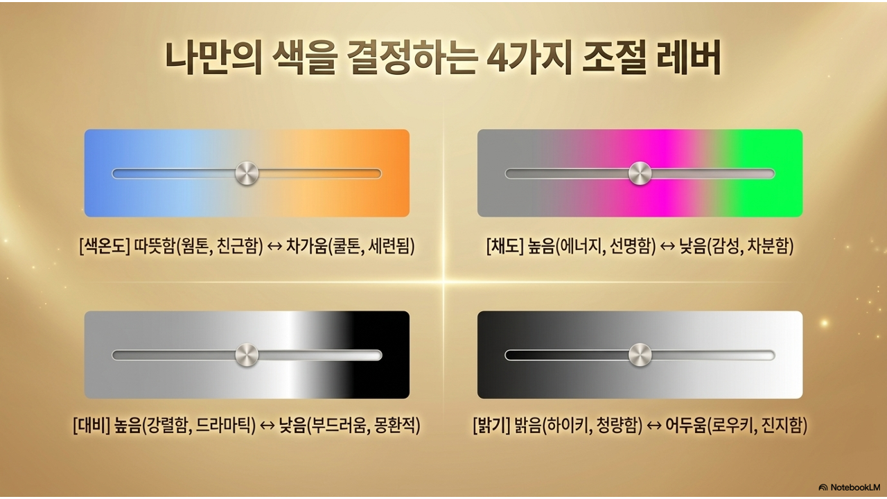 | 채도 | 높음(선명) / 낮음(차분) / 흑백 | 고채도=에너지, 저채도=감성, 흑백=깊이 |