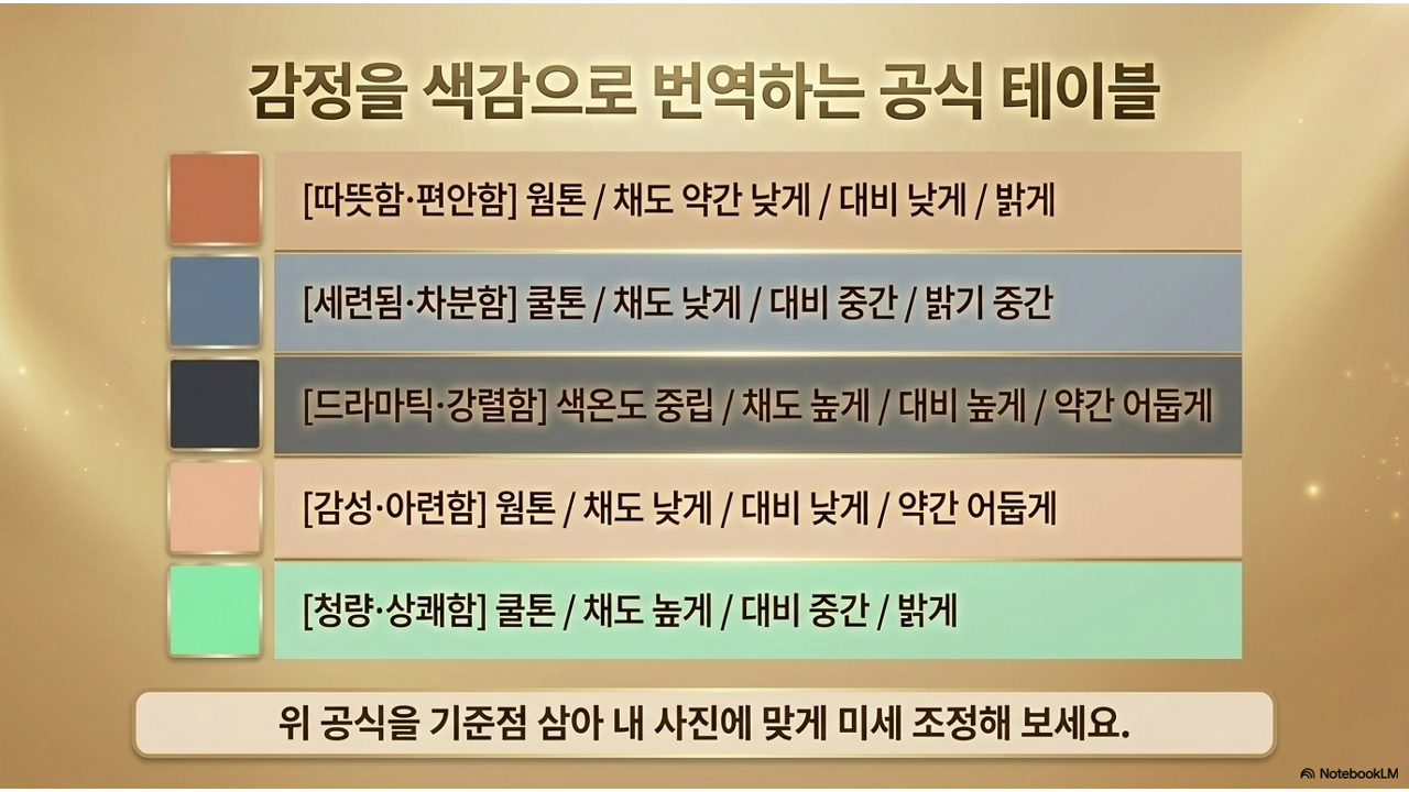 | 감성·아련함 | 웜톤 4,500K | 낮게 | 낮게 | 약간 어둡게 |