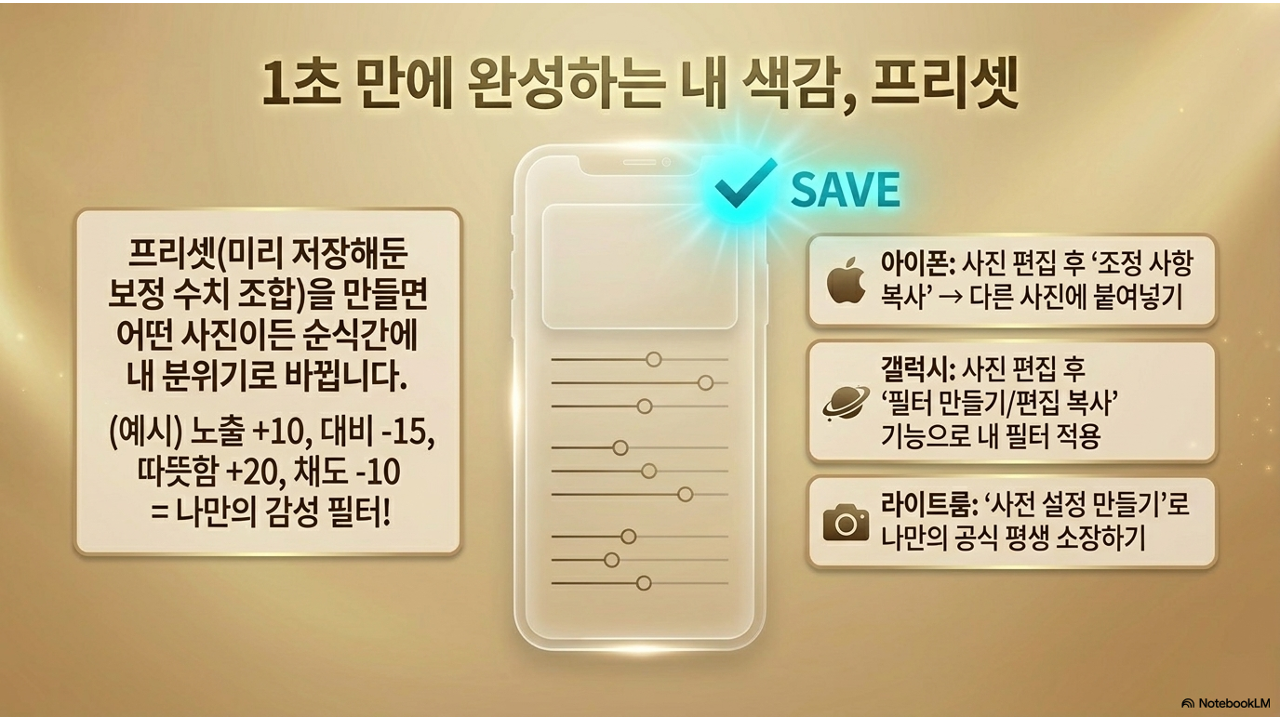 | 라이트룸 모바일 | 보정 후 → '사전 설정(프리셋) 만들기' → 이름 지정 후 저장 → 언제든 불러오기 |