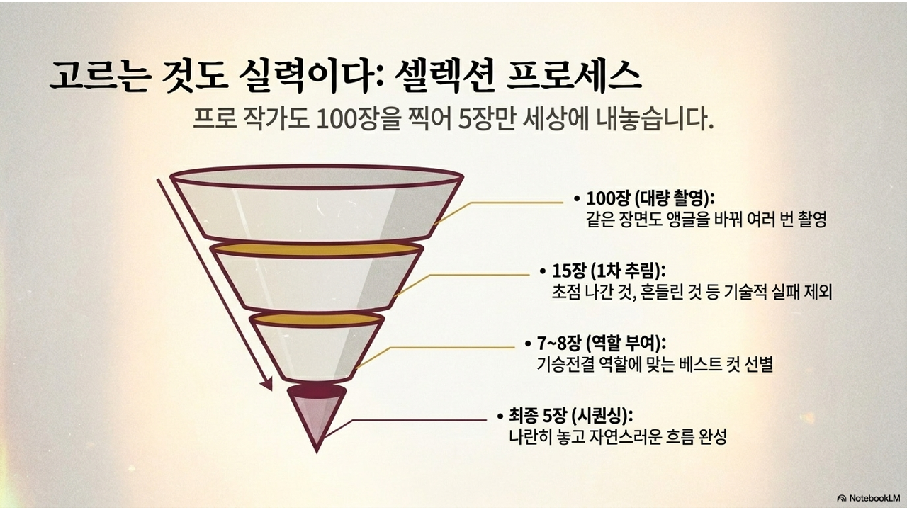 STAGE 01 100 → 15 대량 촬영 → 1차 추림 한 장면당 최소 5장 이상 촬영. 1차 추림에서 기술적 실패(초점 나감, 흔들림, 노출 실패)를 제외하고 후보 15장을 남깁니다. |
