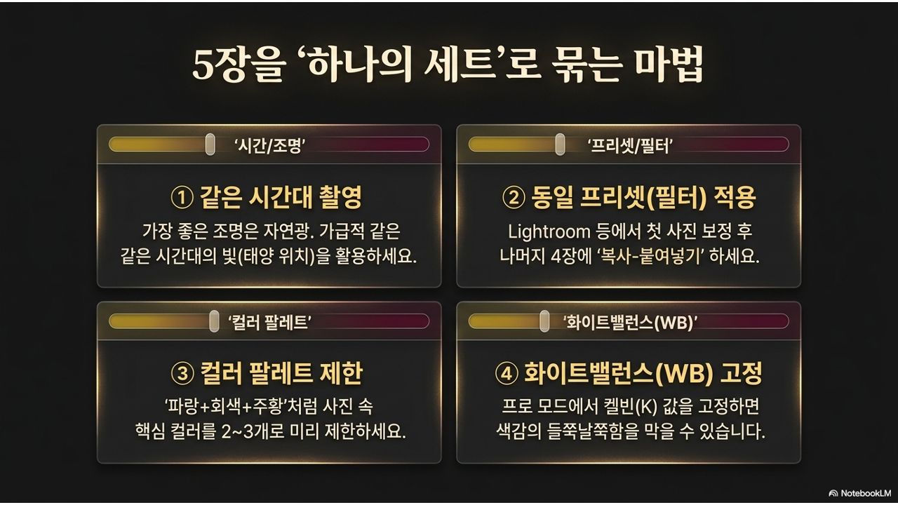 사진 연작에서 가장 흔한 실패는 "5장이 각각 다른 사진처럼 보이는 것". 기술적으로는 잘 찍었는데, 나란히 놓으면 통일감이 없어서 '연작'이 아니라 '개별 사진 모음'처럼 보이는 경우입니다.