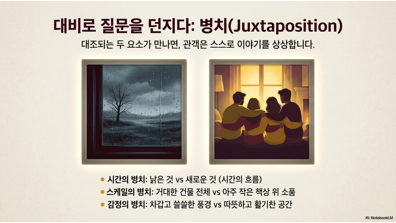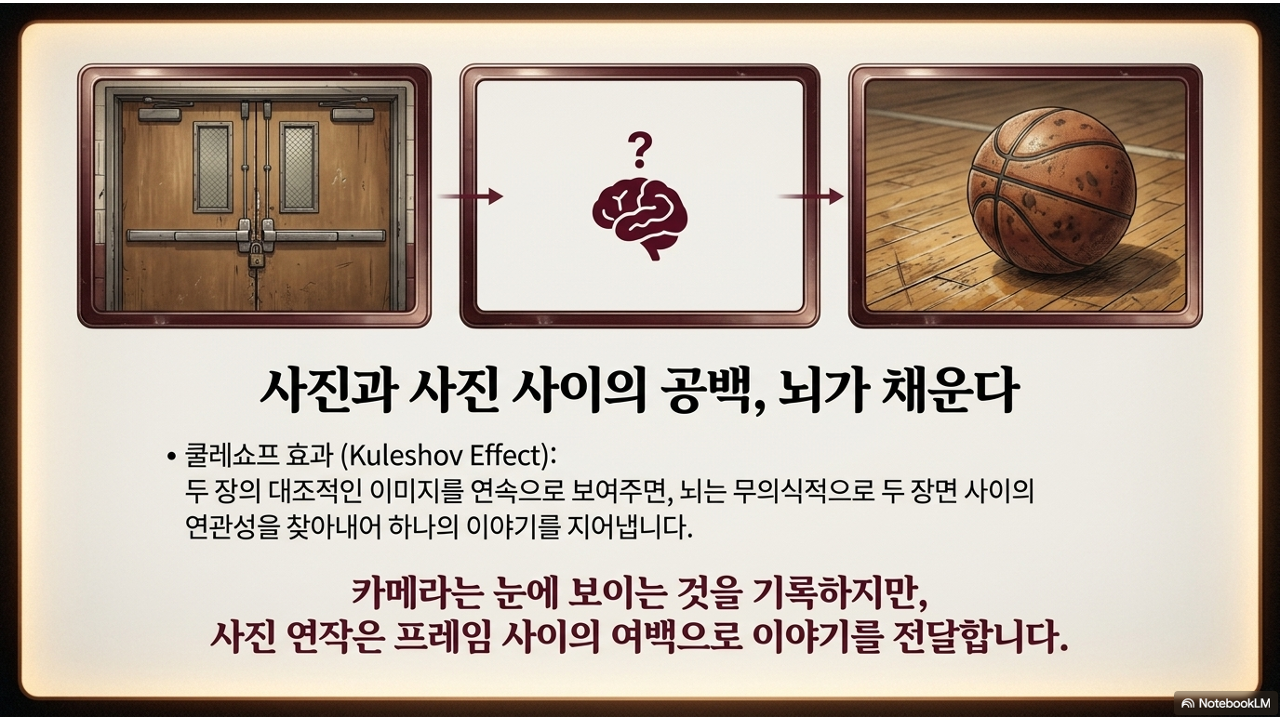 사진 연작도 정확히 같은 원리. "텅 빈 교실"(①) 다음에 "등교하는 발걸음"(②)이 오면, 보는 사람은 자동으로 "아, 학교에 학생들이 도착하기 시작하는구나"를 느낍니다. 두 사진 사이의 '공백'이 오히려 이야기의 힘을 강화합니다.