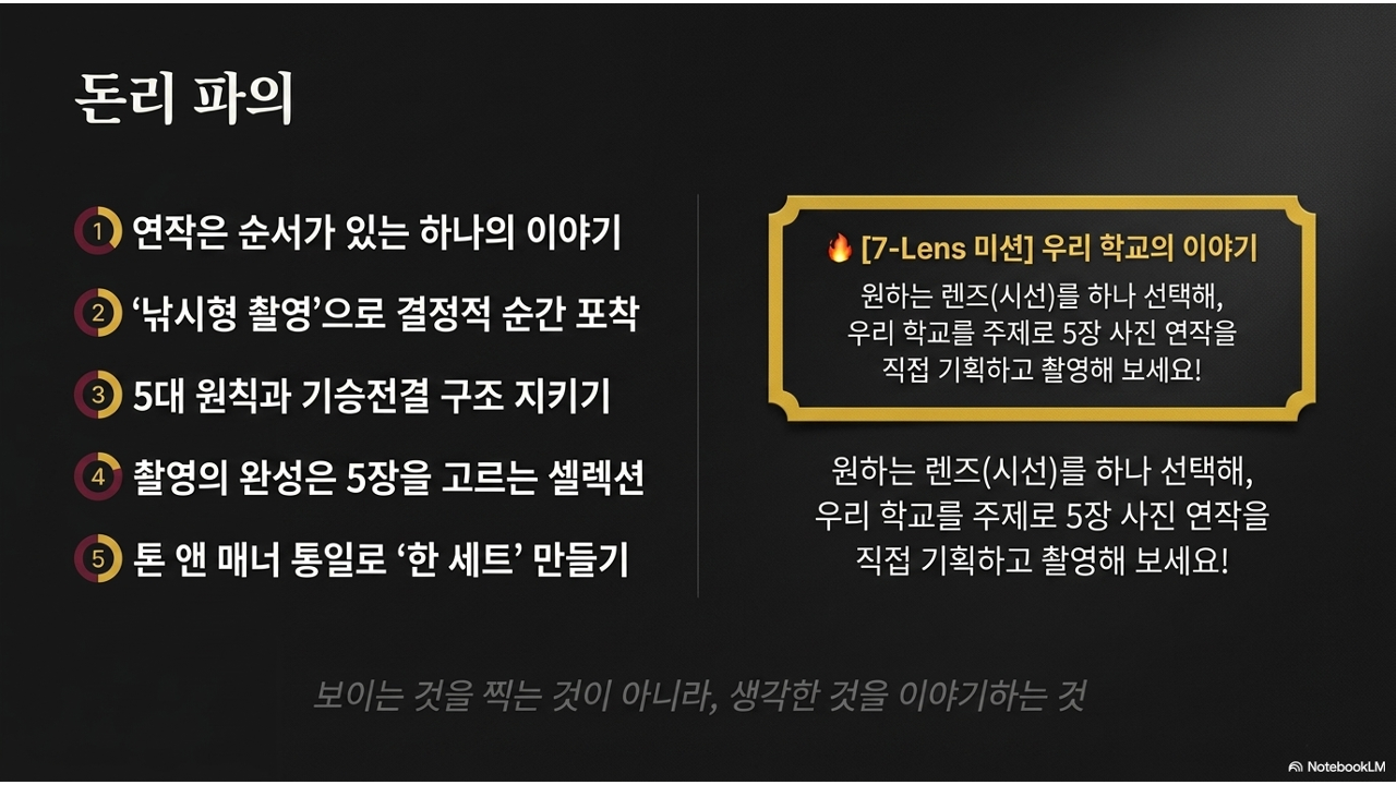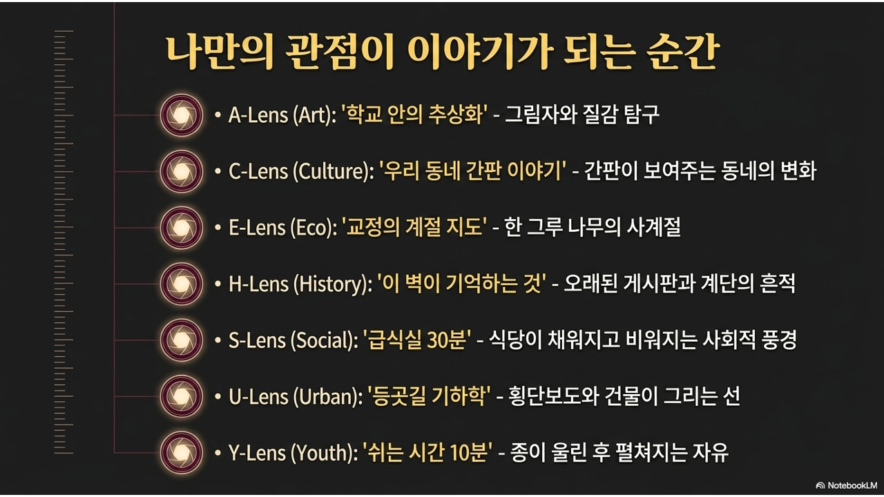 1차시부터 10차시까지 개별적으로 만났던 7-Lens 시선들이, 사진 연작에서 비로소 이야기의 프레임워크가 됩니다. 각 렌즈가 곧 연작의 주제이자 관점이 됩니다.