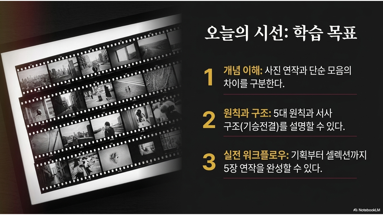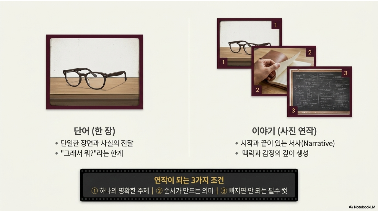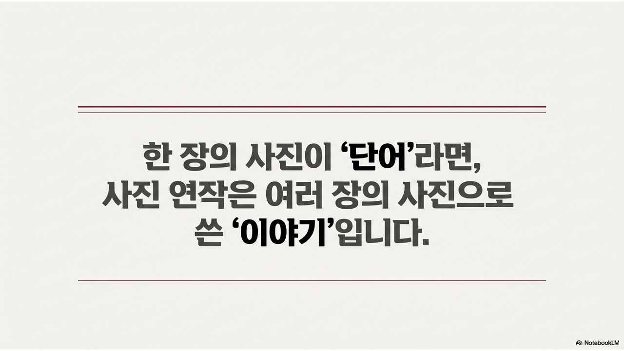 1차시부터 10차시까지 우리는 '한 장의 사진'을 잘 찍는 기술을 배웠습니다. 구도, 빛, 색감, 보정, 톤앤매너까지. 이제 한 단계 더 나아갑니다. 여러 장의 사진을 하나의 주제로 엮어서, 한 장으로는 전달하기 어려운 깊이 있는 이야기를 만드는 것 — 이것이 11차시의 핵심입니다.