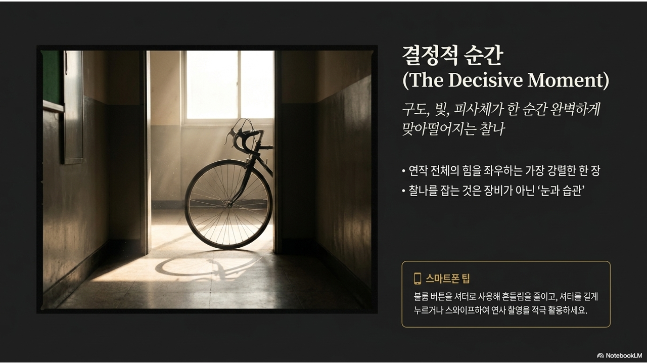카메라 교재에서도 "결정적인 순간을 포착"하는 것을 디지털 SLR 카메라의 핵심 설계 철학으로 소개합니다. 빠른 오토포커스, 즉각적인 셔터 반응, 연속 촬영 — 이 모든 기술이 그 한 순간을 놓치지 않기 위한 것입니다. 스마트폰에서도 마찬가지입니다. 결정적 순간은 장비의 문제가 아니라 눈과 습관의 문제입니다.