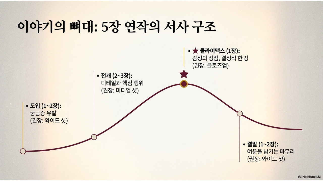1~2장 도입부 와이드 샷으로 장소와 분위기. "어떤 이야기가 시작될까?" 궁금증 유발. 영화 오프닝처럼. |