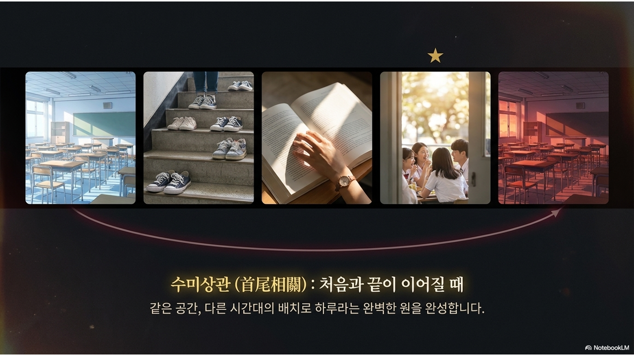 시간의 흐름 기승전결이 느껴지는 순서가 있어야. 순서를 바꾸면 이야기가 어색해져야 합니다. 반드시 물리적 시간(아침→저녁)일 필요는 없습니다. 감정의 변화, 공간의 이동, 주제의 심화 — 어떤 형태든 '진행'이 느껴지면 됩니다. |