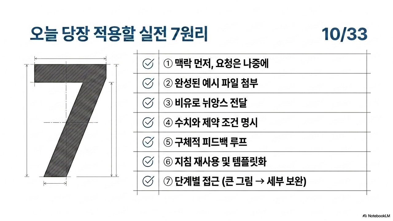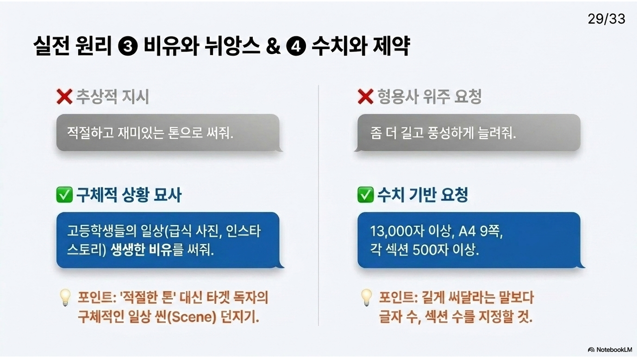 | 원리 ❹ (수치) | 지침에 분량·형식 기준을 명시해 두면 매번 준수 |