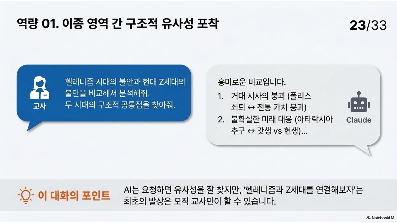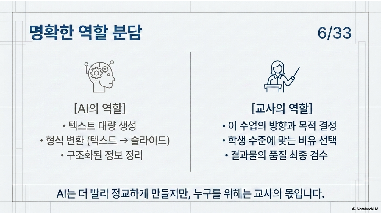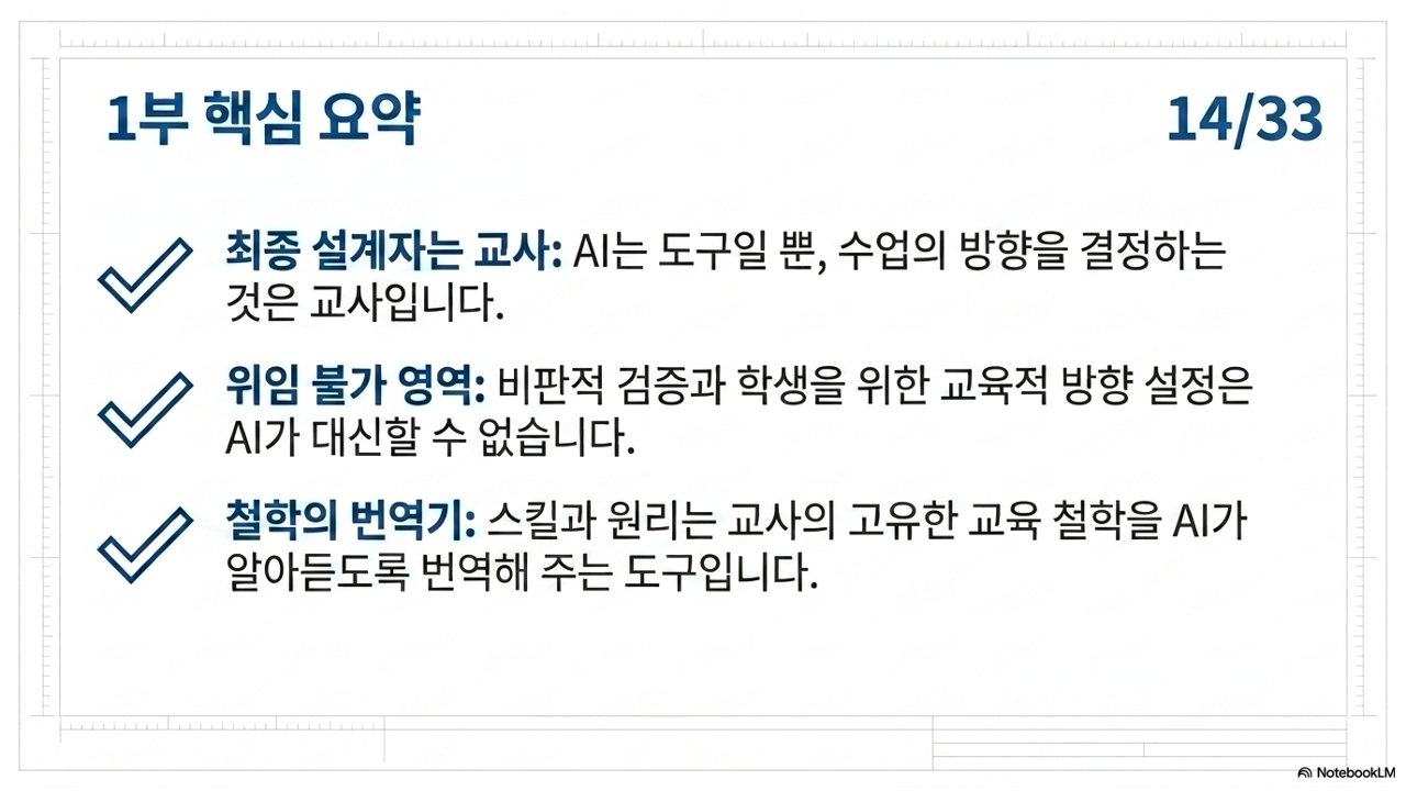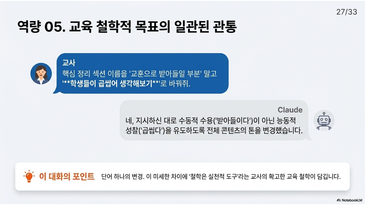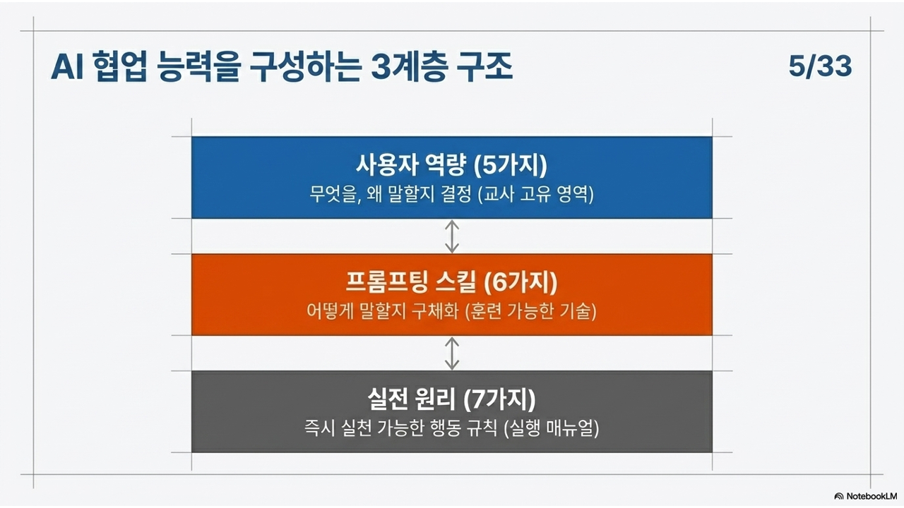 이 가이드의 6가지 스킬은 그 결정을 AI에게 정확히 전달하는 도구이고, 5가지 역량은 그 결정을 내리는 교사의 전문성입니다.
