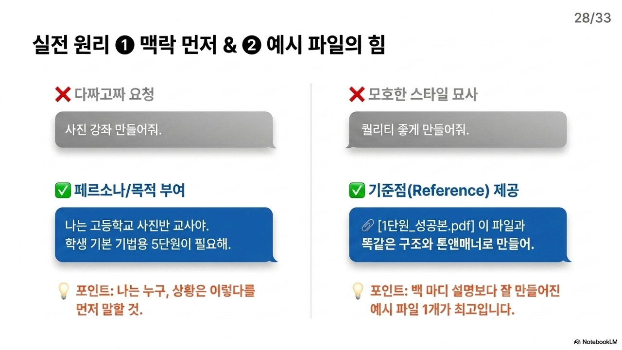 | 원리 ❶ (맥락) | 지침에 한 번 적어 두면 매번 자동 적용 |