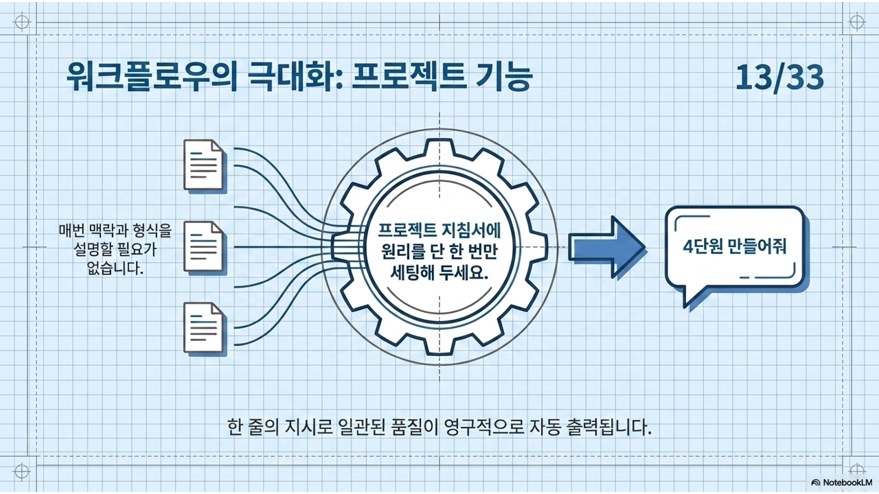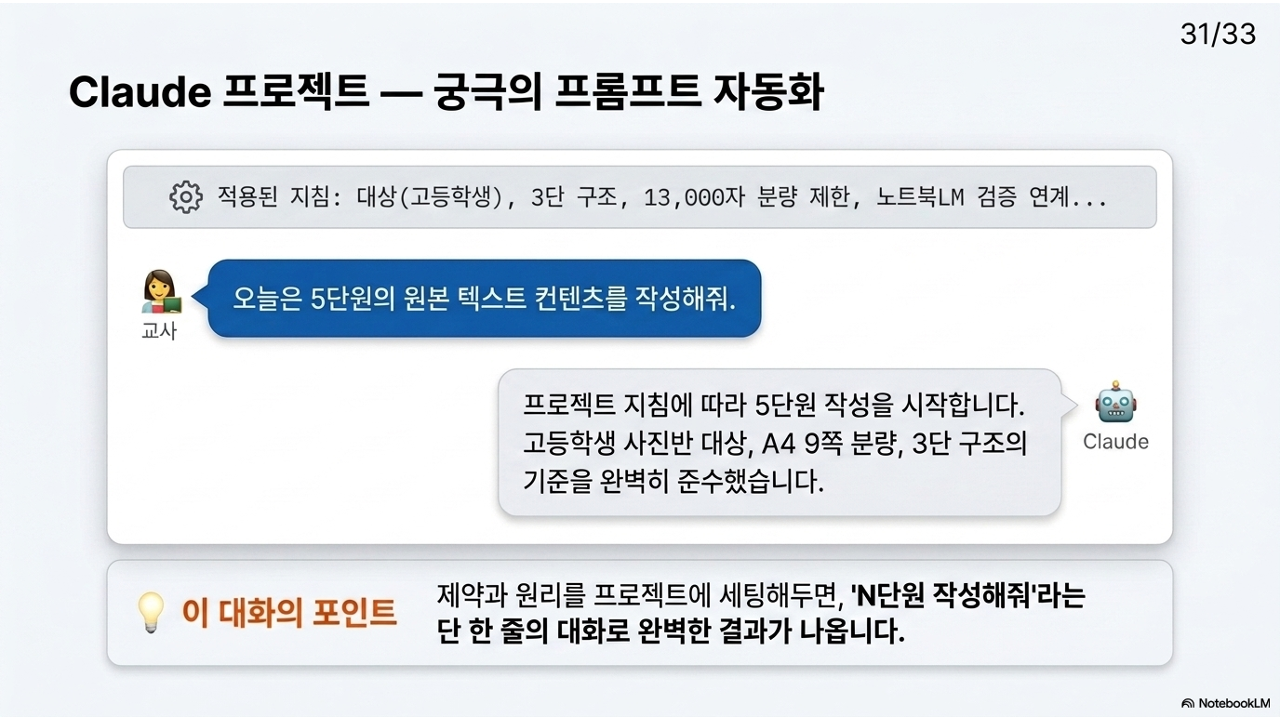 일반 채팅에서는 매번 맥락을 다시 설명해야 합니다. 그러나 Claude 프로젝트를 사용하시면 프로젝트 지침이 모든 채팅에 자동으로 적용되므로, 한 줄의 요청("챕터 4 콘텐츠 2 만들어 주세요")만으로도 일관된 품질의 결과물이 나옵니다.