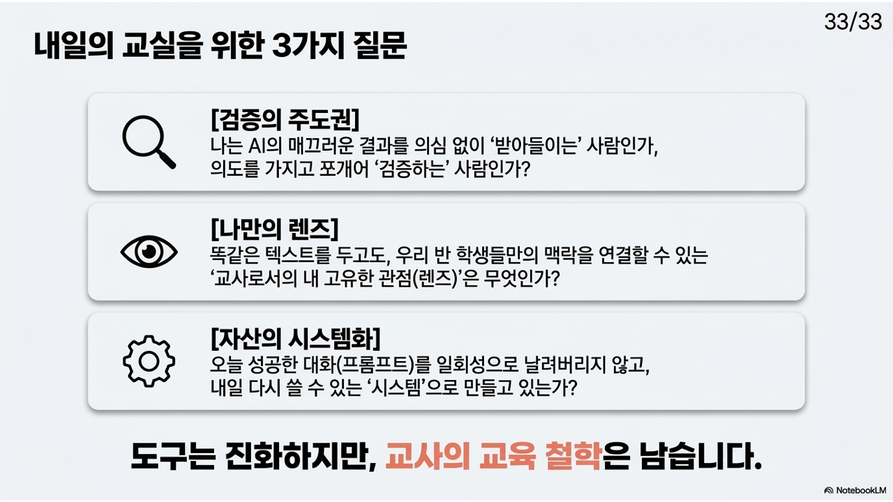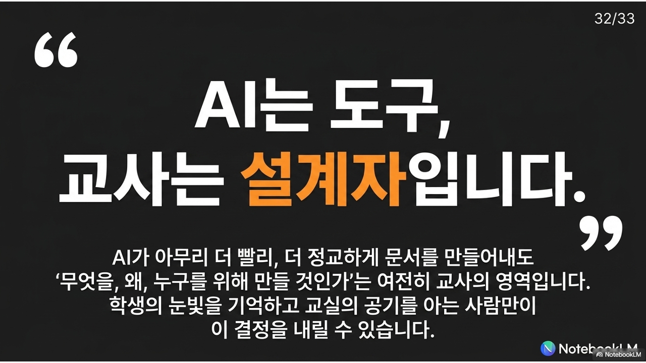 AI가 아무리 뛰어난 결과물을 만들어 낸다 해도, "무엇을, 왜 만들 것인가"의 결정은 교사의 몫입니다. 학생을 직접 만나고, 학생의 눈빛을 기억하고, 교실의 공기를 아는 사람만이 할 수 있는 결정입니다.