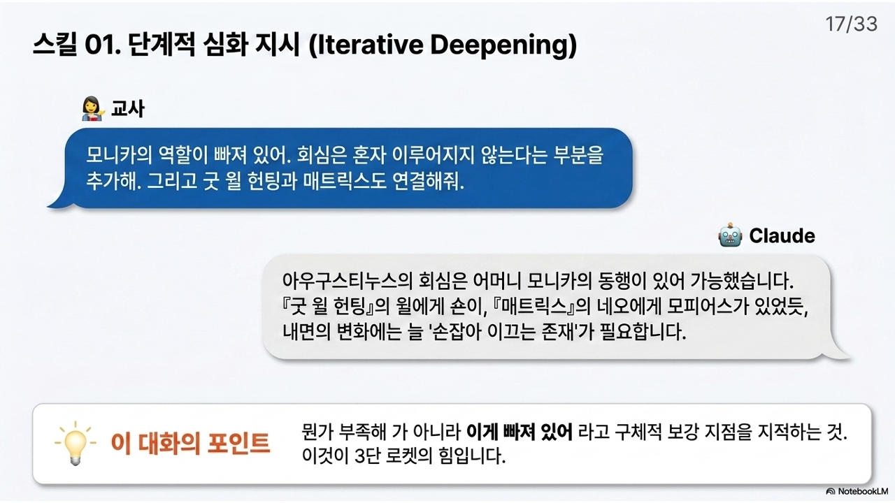 이는 교사의 교육적 판단(역량 2)이 스킬 2를 통해 AI에게 전달된 전형적 사례입니다. "어떤 아우구스티누스를 학생에게 보여줄 것인가"라는 결정은 전적으로 교사의 몫입니다.