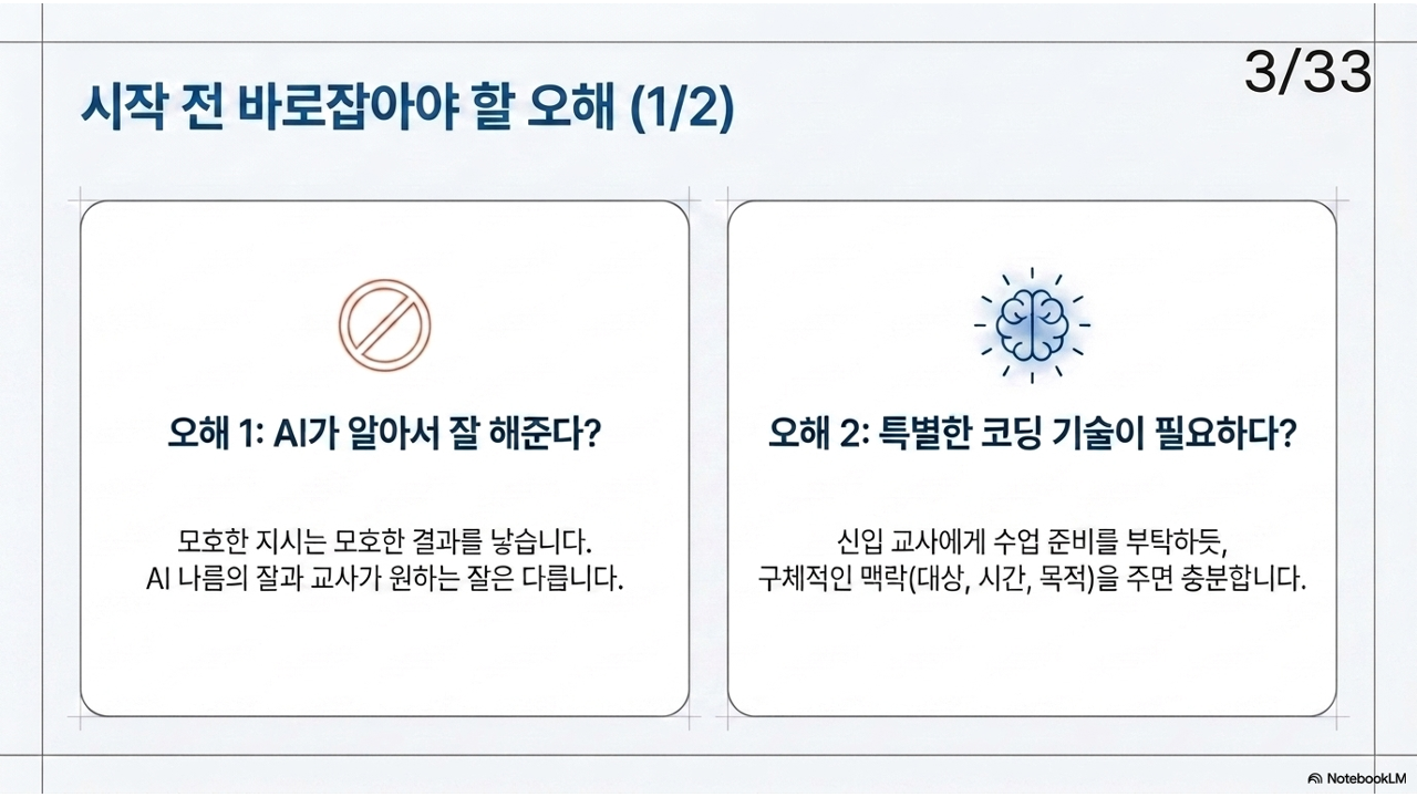 ❌ MYTH "AI에게 시키면 알아서 잘 해준다" 현실은 그렇지 않습니다. AI는 지시가 모호하면 모호한 결과를 돌려줍니다. "잘 만들어 주세요"라고 요청하면 AI 나름의 '잘'이 출력될 뿐이며, 그것이 선생님께서 원하시는 '잘'과 일치할 확률은 매우 낮습니다. |