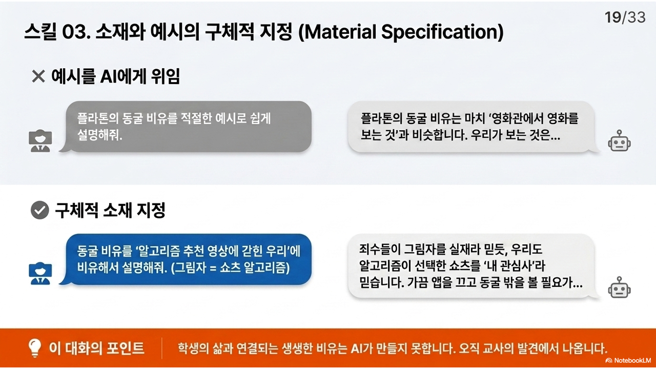 추상적 주제를 다룰 때, AI가 사용할 구체적 소재와 사례, 비유를 교사가 직접 제시하는 기술입니다. 교사의 독서, 생활 경험, 오랫동안 축적된 배경지식이 이 스킬의 원천입니다.