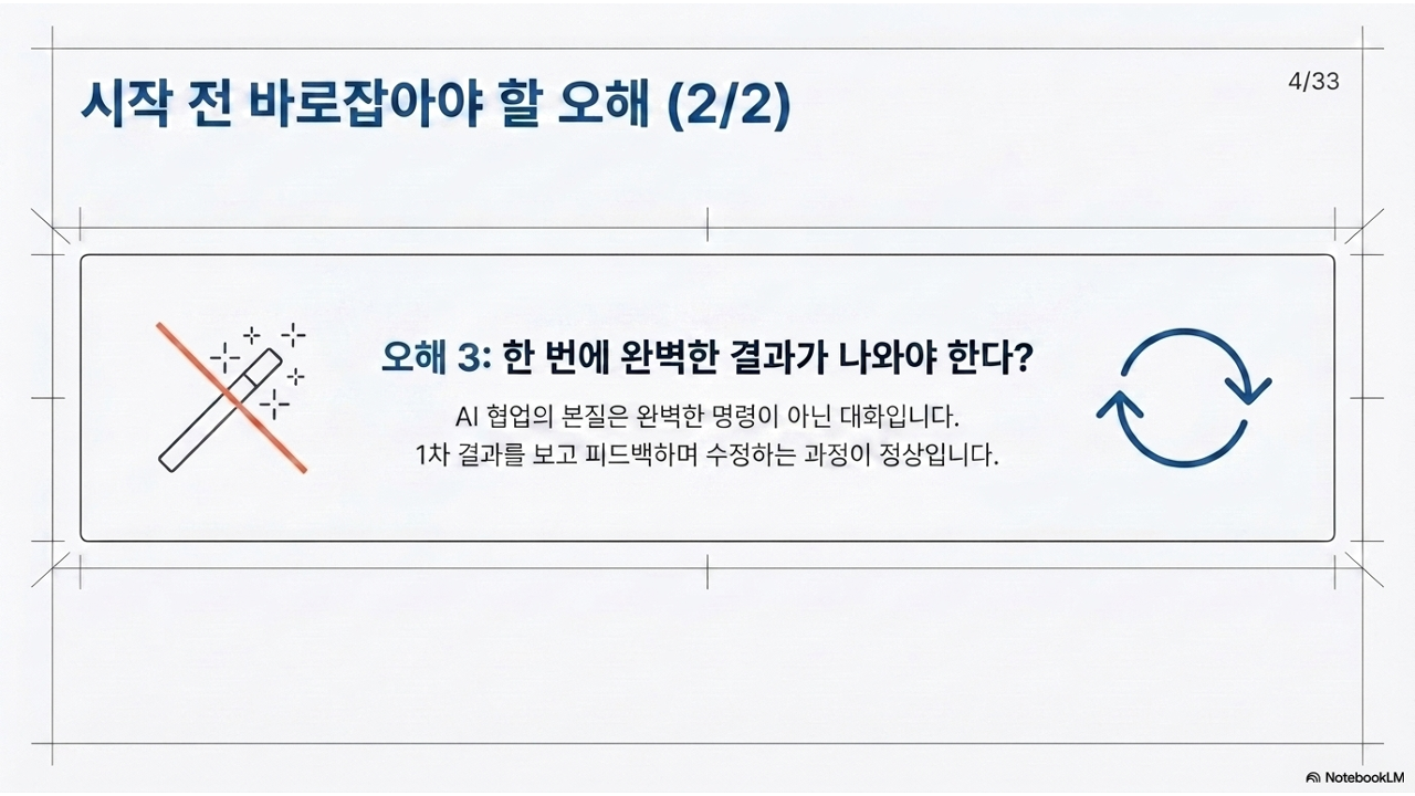 ❌ MYTH "한 번에 완벽한 결과물이 나와야 한다" AI와의 협업은 대화입니다. 1차 결과물을 확인하고, 부족한 부분을 구체적으로 짚어 드리고, 다시 요청하고, 또 수정하는 과정이 매우 자연스럽고 당연한 흐름입니다. 이 반복 과정이야말로 결과물의 품질을 끌어올리는 핵심입니다. |