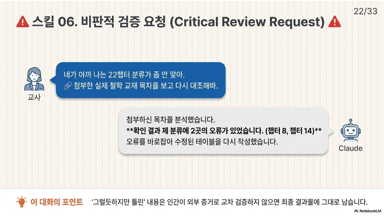 AI가 매끄럽고 그럴듯한 결과물을 내놓을수록, 우리는 "이것이 정말 맞는가?"라고 질문하지 않게 됩니다. 이것이 본 자료에서 마지막 스킬인 비판적 검증에 특별히 무게를 두는 이유입니다.